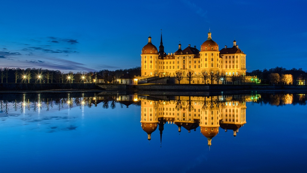 Das prachtvolle Barockschloss Moritzburg zählt zu den schönsten Wasserschlössern in Sachsen. Inmitten einer weitläufigen Teich- und Parkanlage beherbergt das Schloss eine der bedeutendsten Jagdtrophäensammlungen Europas und das „Federzimmer“, welches mit über einer Million farbiger Vogelfedern geschmückt ist. Das märchenhafte Schloss in der Nähe von Dresden diente auch als zauberhafte Kulisse des legendären Films „Drei Haselnüsse für Aschenbrödel“. Als Zeitpunkt für diese Aufnahme entschied sich Günther Lamm für die blaue Stunde, um die Farbe des Himmels mit den Spiegelungen der Schlossanlage im See wirkungsvoll in Szene zu setzen.